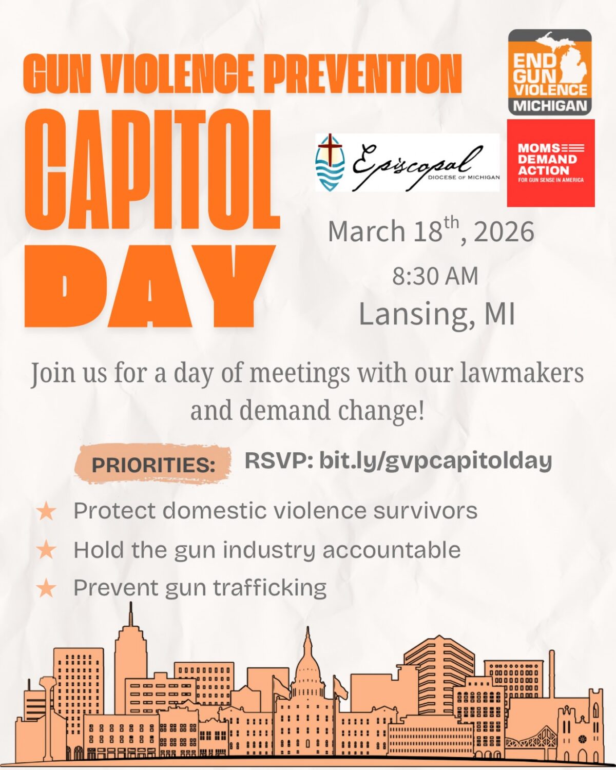 Will I be meeting with lawmakers? If you register for the advocacy day through End Gun Violence Michigan, yes, you will be meeting with law makers. If you would like to meet with lawmakers, please sign up through End Gun Violence Michigan via the button below.